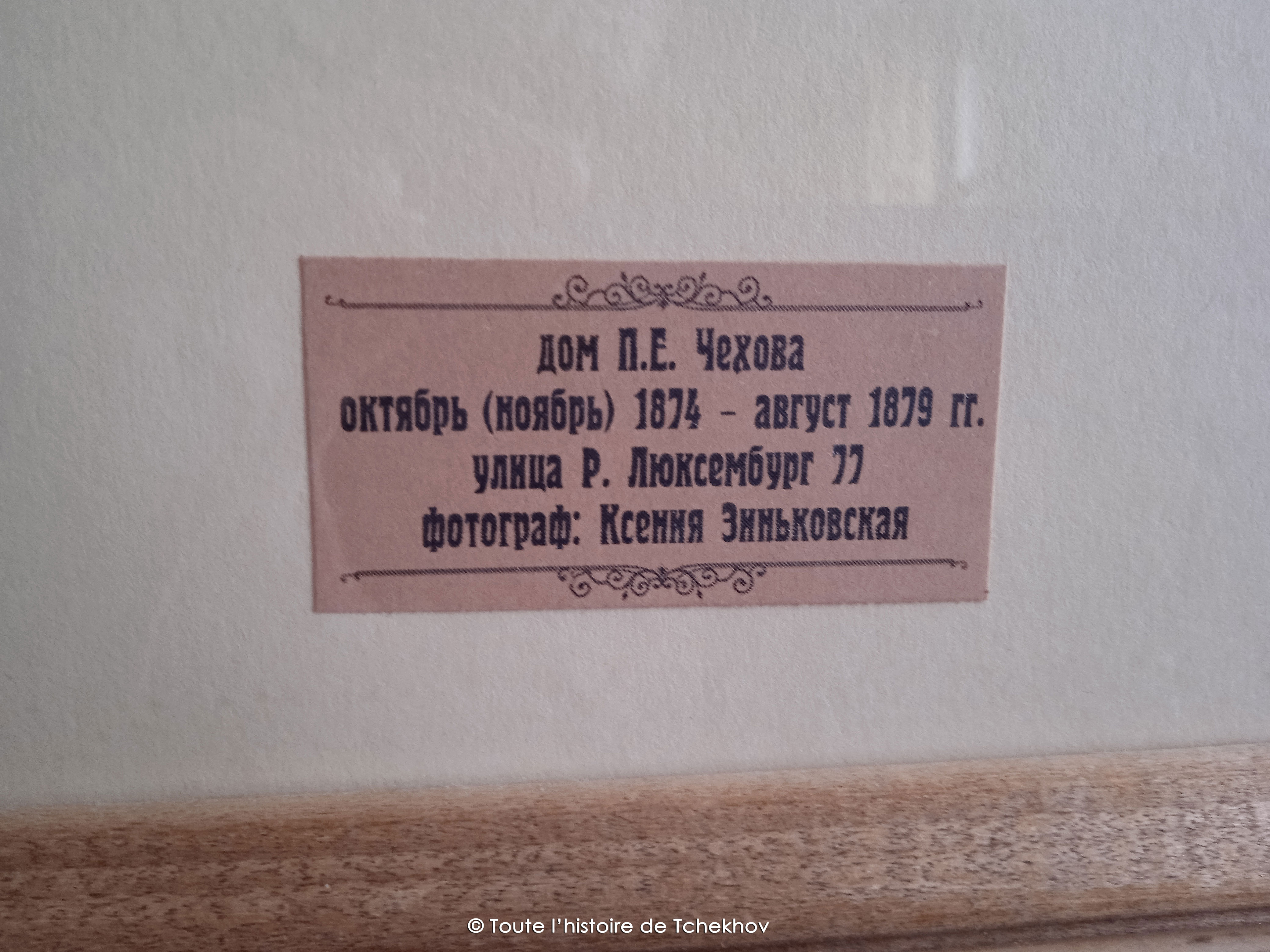La famille Tchekhov changea huit fois d’adresse à Taganrog : trois de ces lieux sont aujourd’hui devenus des musées mémoriels, tandis que les autres portent des plaques commémoratives.
